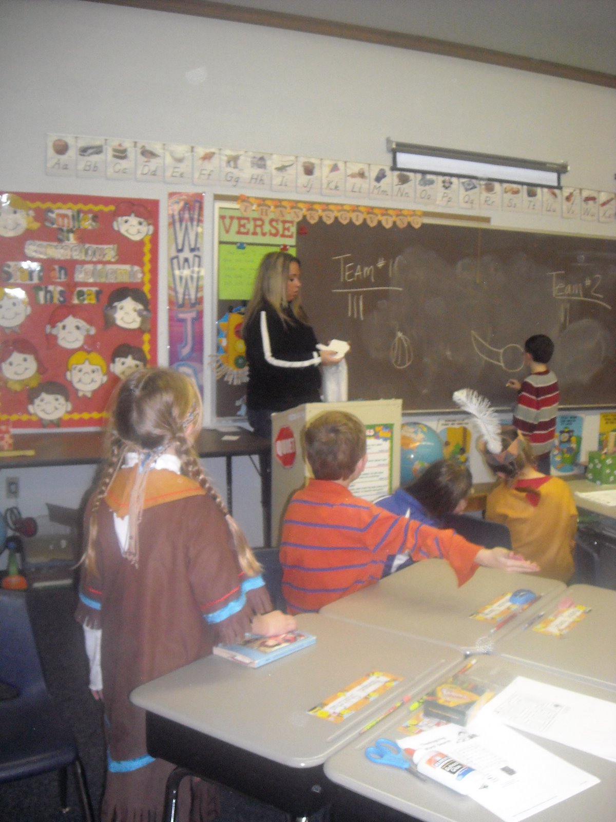 One of my new friends. M., is one of the best homeroom moms. She loves planning and coordinating. We all love her. I can show up and do my task with fun. Here is the class playing Pictionary with Thanksgiving words.